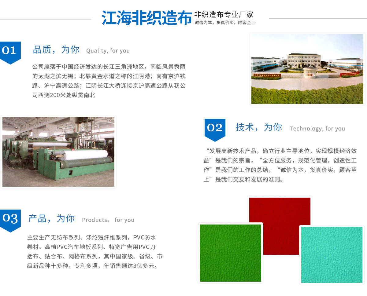 江海企業(yè)有江陰市江海非織造有限公司、江陰市江海防水材料有限公司、江陰市三江寬幅無(wú)紡布有限公司、江陰市三江織物涂層新材料有限公司組成,均屬于江蘇省民營(yíng)科技企業(yè)。企業(yè)現(xiàn)擁有員工近千名,占地15萬(wàn)平方米,廠(chǎng)房建筑面積達(dá)80000多平方米,凈資產(chǎn)超億元,主要生產(chǎn)無(wú)紡布系列、滌綸短纖維系列、PVC防水卷材、高檔PVC汽車(chē)地板系列、特寬廣告用PVC刀括布、貼合布、網(wǎng)格布系列,其中國(guó)家級(jí)、省級(jí)、市級(jí)新產(chǎn)品十多種,專(zhuān)利多項(xiàng),年銷(xiāo)售額達(dá)3億多元。